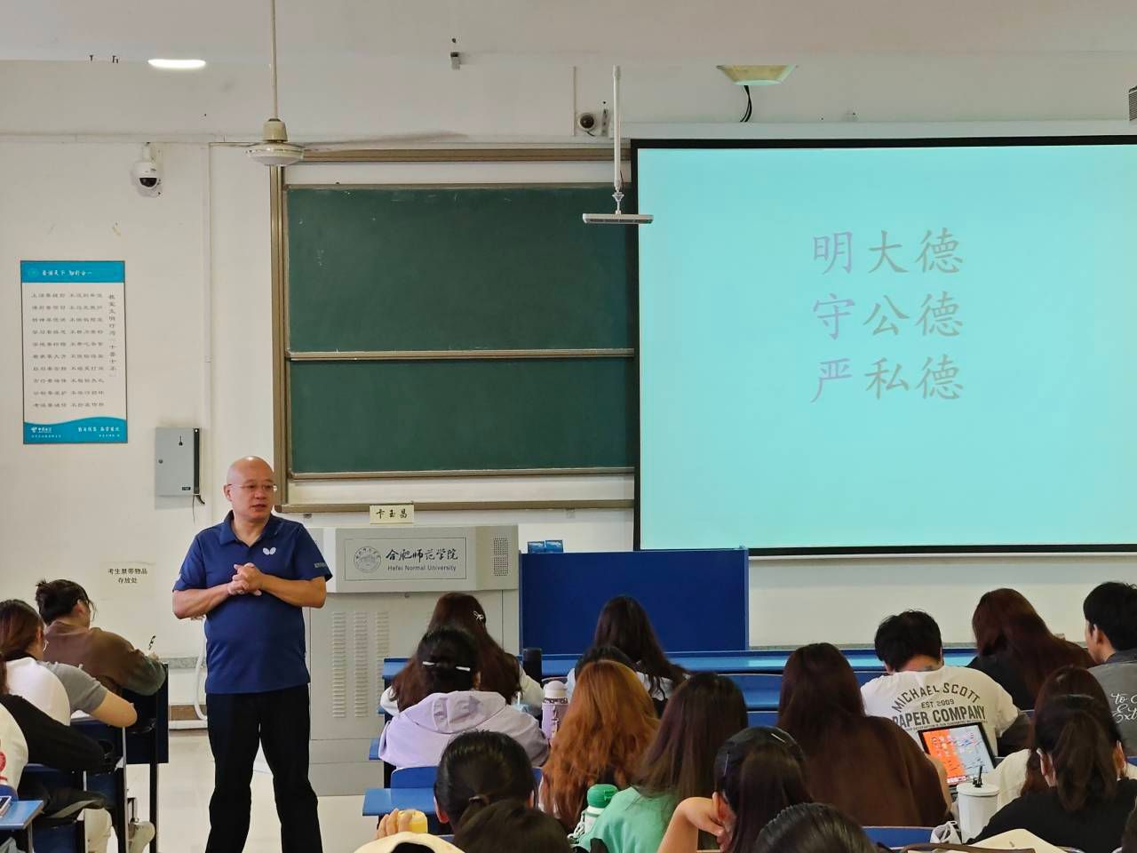 本网讯 为进一步加强师范生师德教育和实习工作,9月21日上午,日产无码久久久久久精品在锦绣校区逸夫楼A201教室开展师德教育活动。学院邀请合肥市屯溪路小学书记、校长卞玉昌以《从文化属性探究师德的现实意义》为主题进行了师德教育指导。日产无码久久久久久精品2021级小学教育专业全体学生参加了活动,活动由日产无码久久久久久精品副院长闫龙主持。