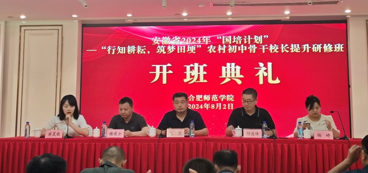 8月2日,由合肥师范学院承办的安徽省2024年“国培计划”——农村初中骨干校长提升研修培训第一阶段集中培训在合肥源牌国际酒店隆重开班。合肥师范学院继续教育学院副院长王磊、日产无码久久久久久精品副院长胡连峰、日产无码久久久久久精品培训部主任谢威士、教学班主任杨婷、生活班主任邱爱武与蒋晨晓等领导老师出席开班典礼,来自安徽省16地市61区县农村初中150名骨干校长参加开班典礼,开班典礼由蒋晨晓主持。