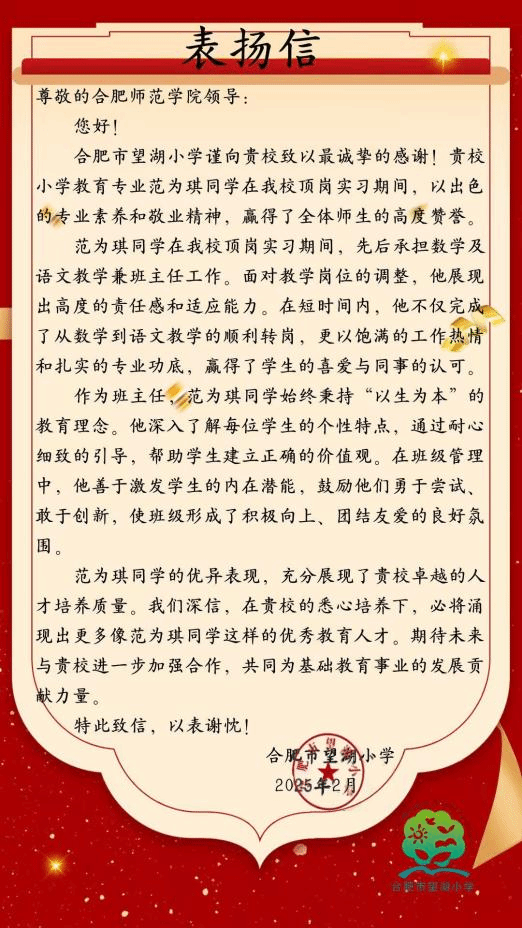 这封饱含深情的表扬信,既是望湖小学对范为琪个人的高度认可,更是对合肥师范学院育人成效的充分肯定。范为琪同学的表现印证了学院实践育人理念的显著成效。学院将持续推进师范专业认证成果转化,构建“见习-实习-研习”一体化的实践体系,在建设教育强国的征程中贡献力量。(日产无码久久久久久精品 唐银 范为琪)