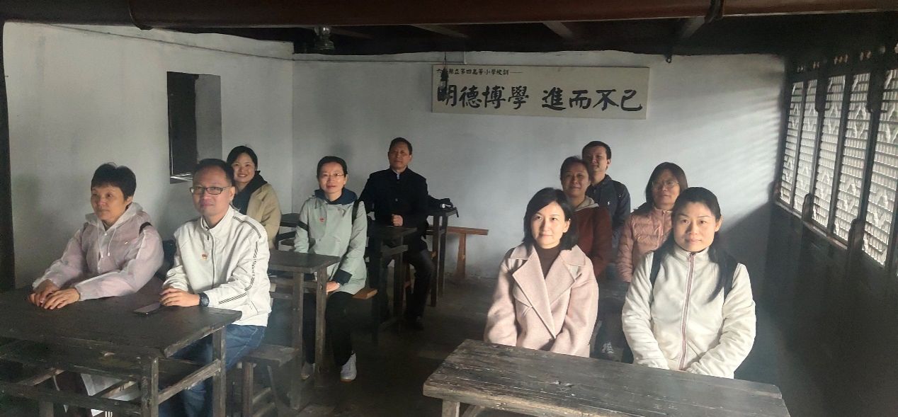 随后,教育系教工党支部党员走进六安县立第四高等小学旧址。学校始建于1909年(宣统元年),1918年被确定为六安县立第四高等小学。1929年著名的“六霍起义”在独山打响第一枪,学校即为暴动指挥部。1931年,学校由苏维埃直接领导,更名为“六安县苏维埃列宁模范小学”,1933年改称“六安县独山小学”。教室中悬挂着六安县立第四高级小学校训“明德博学,进而不已”。党员教师走进教室,体验当年小学学校生活和学校的精神文化。