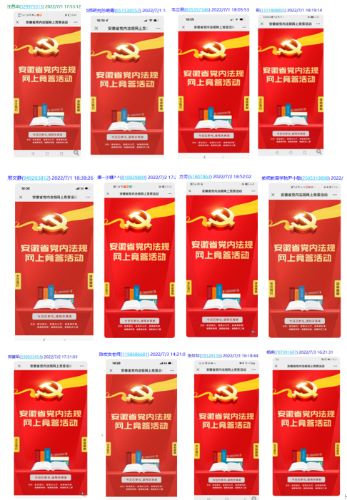 为深入贯彻落实习近平总书记关于依规治党的重要论述精神,结合庆祝“七一”,在合肥师范学院党委和教师教育学院党委的领导下,2022年7月,教师教育学院教育系教工党支部开展党内法规知识网上竞答活动,教育系党支部全体党员积极参加。
