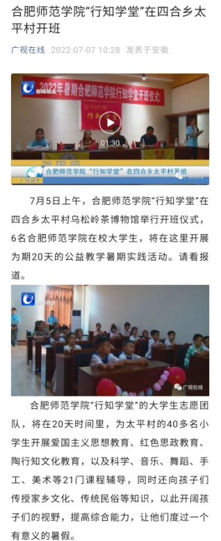 7月5日上午,教师教育学院“慧欢乐”行知学堂的小先生们在宣城广德市四合乡太平村乌松岭茶博物馆举行开班仪式。六名小先生在这里组织开展为期20天的行知学堂实践活动。学堂践行陶行知教育思想,关心关爱留守儿童和城镇务工人员子女,丰富孩子们的暑期生活!广德电视台和广视在线对学堂进行了报道。(教师教育学院:王磊 马璐瑶 纵雯 )