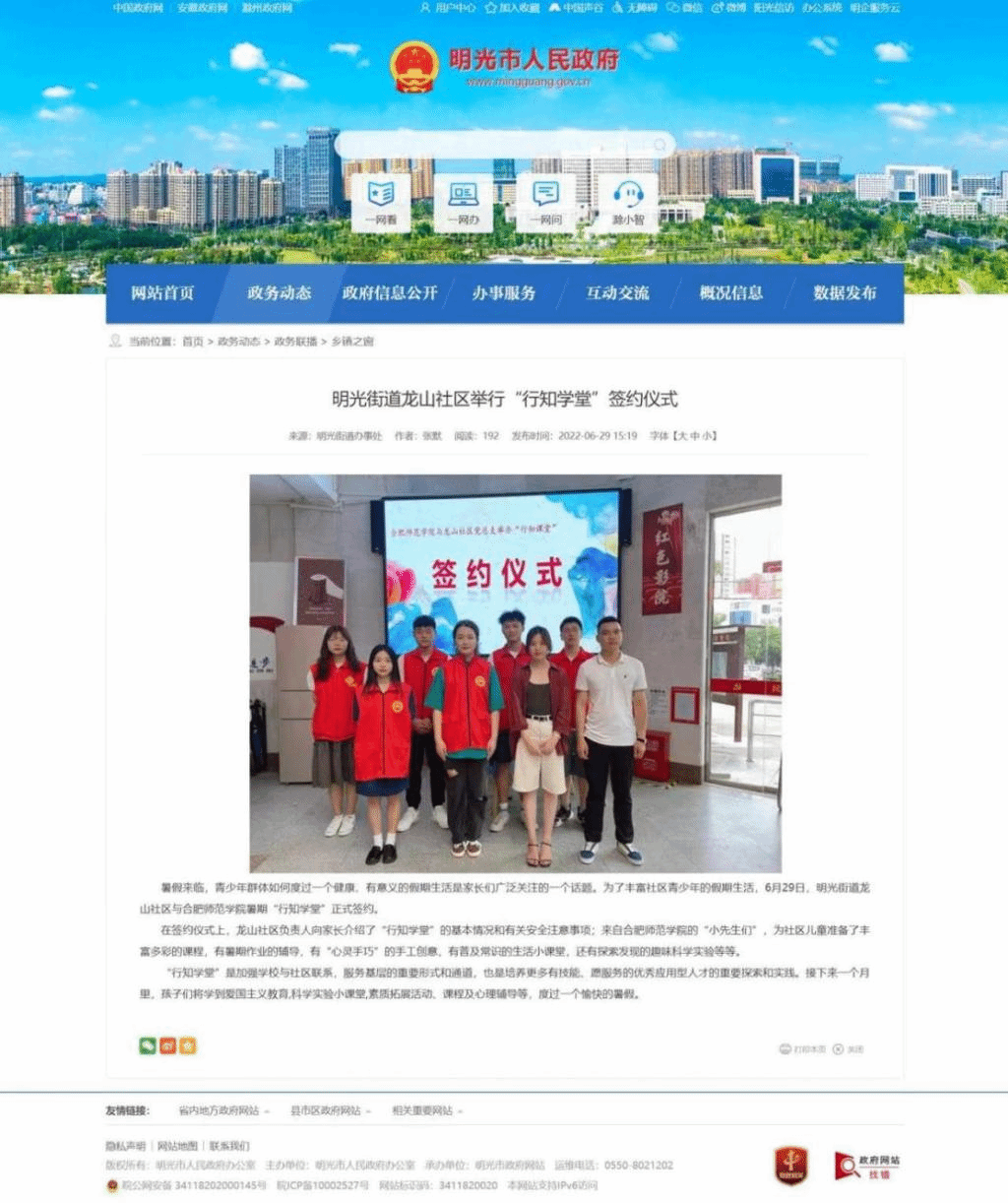 6月29日,教师教育学院“行知学堂”小先生们来到了滁州市明光市明光街道龙山社区,组织开展了暑期“向阳花行知学堂”,服务务工人员子女和留守儿童。小先生们为小学员送去了党史教育、安全教育、科学实践课、传统民俗、心理健康教育、绘画和舞蹈等课程,丰富了小学员的暑期生活,同时也弘扬了中华传统文化,厚植了小学员们爱党爱国爱社会主义的情怀。安徽省明光市人民政府网对学堂开办进行了报道。(教师教育学院:王磊 范宇嘉)