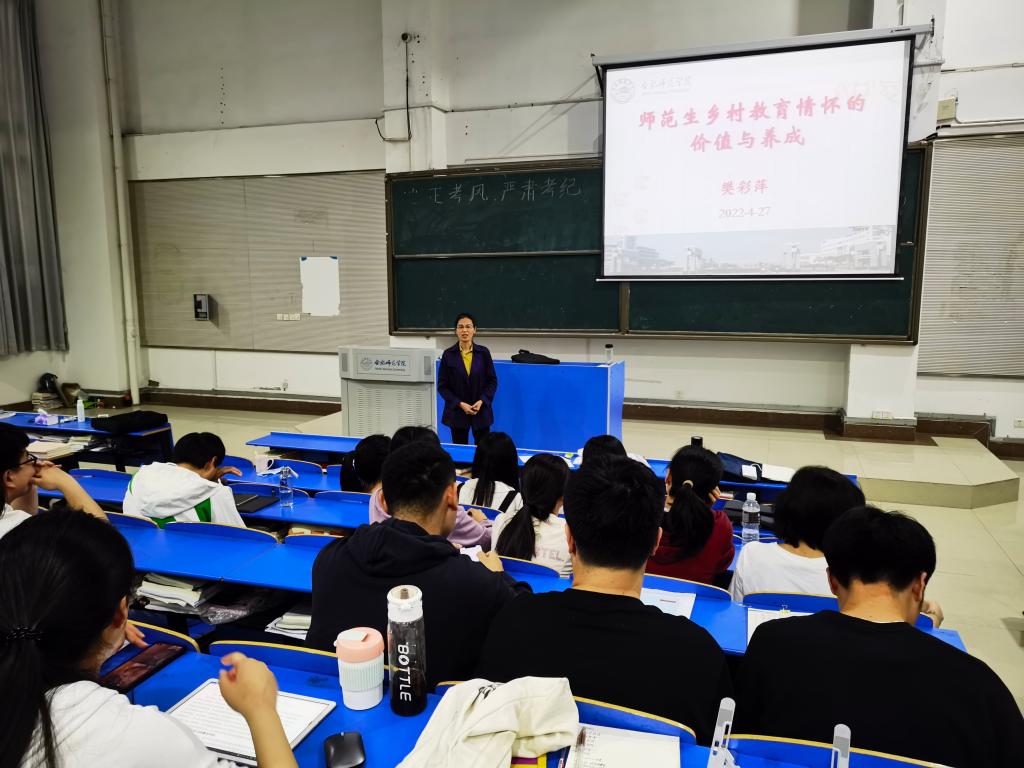 (本网讯)教师教育学院小学教育专业学生是定向招收、定向培养、定向就业的未来乡村教师。为促进学生增强乡村从教意愿、坚定乡村从教信念,4月27日下午,教师教育学院在锦绣校区逸夫楼西阶一教室举办了题为“师范生乡村教育情怀的价值与养成”的学术讲座。讲座由教师教育学院研究员樊彩萍主讲,2018级、2019级小教专业学生参加学习、交流。