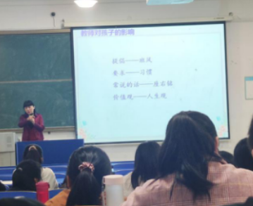 合肥市名班主任、西园小学副校长、高级教师杨韧为同学们进行小学师德教育专题讲座,详细解读了“师德”的内涵。她风趣地以苏轼、李白为例,解读了“四有”好老师的含义,深入解析理想信念、道德情操、扎实学识、仁爱之心的概念,她还结合自身的教学实践经验,详细解读了如何做一名有高尚师德的教育工作者。