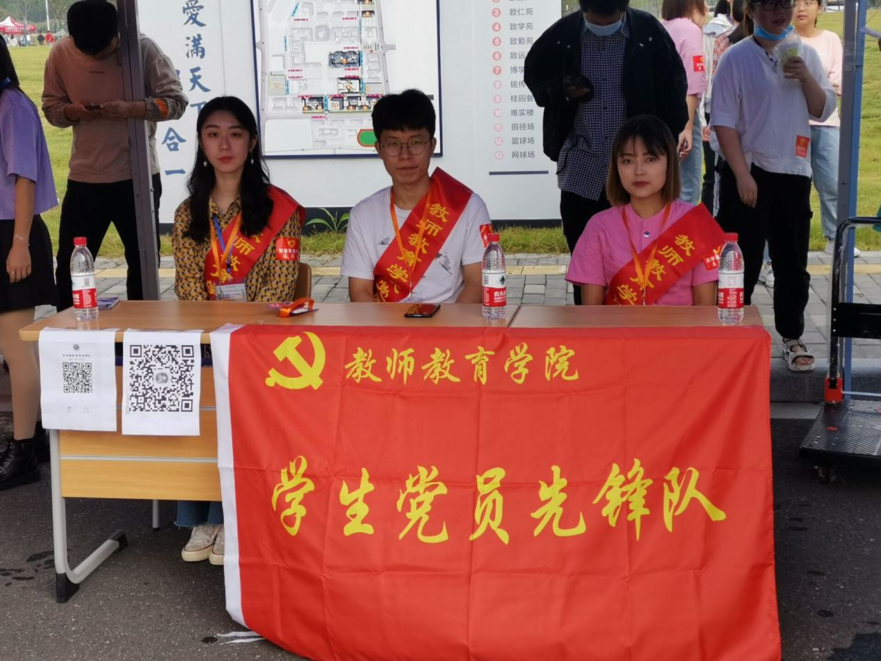 进入校园的道路两侧,学院的学生党员先锋队笑容满面,为新生提供咨询服务。