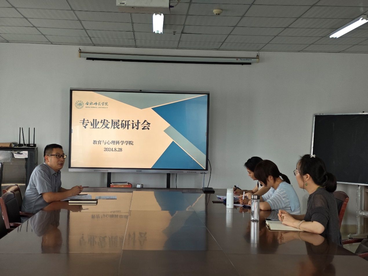 为深入贯彻落实教育部“四新”建设精神,推进专业升级改造,进一步明确专业发展思路与建设重点任务,8月28日下午,日产无码久久久久久精品副院长胡连峰,小学教育系主任唐银,心理系主任黄凤,学前教育系主任孙延永共同研讨专业高质量发展事宜。