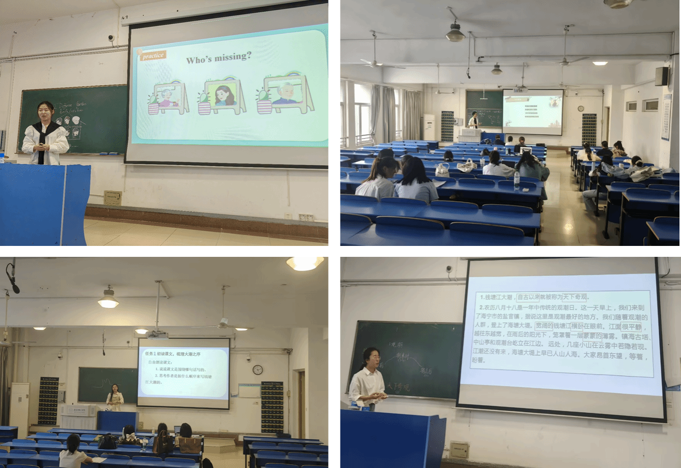 实战演练环节是本次大练兵活动的关键部分。4月23日14:50,进入面试的学生分学科进行“无生试讲”,来自2024级、2023级和2022级三个年级的师范生同台竞技,聚焦10分钟精彩教学环节,在三尺讲台上展开教学能力的比拼。模拟授课现场,选手们各展风采,通过生动的教学语言、丰富的教学手段,营造出活跃的课堂氛围。有的通过创设趣味情境导入新课,有的借助多媒体技术直观呈现知识要点,还有的设计互动问答激发思维碰撞。学院邀请了三位专业教学经验丰富的教师担任评委,学校学科教学论教研室陈庆华、吴皖赣、吴姗姗、郭辰、邓珍珍等多位老师参与评审,从教学目标达成、教学方法运用、板书设计等多个方面进行细致点评。整个赛场精彩纷呈,高潮迭起,充分展现了师范生们良好的教学素养与蓬勃向上的精神风貌。