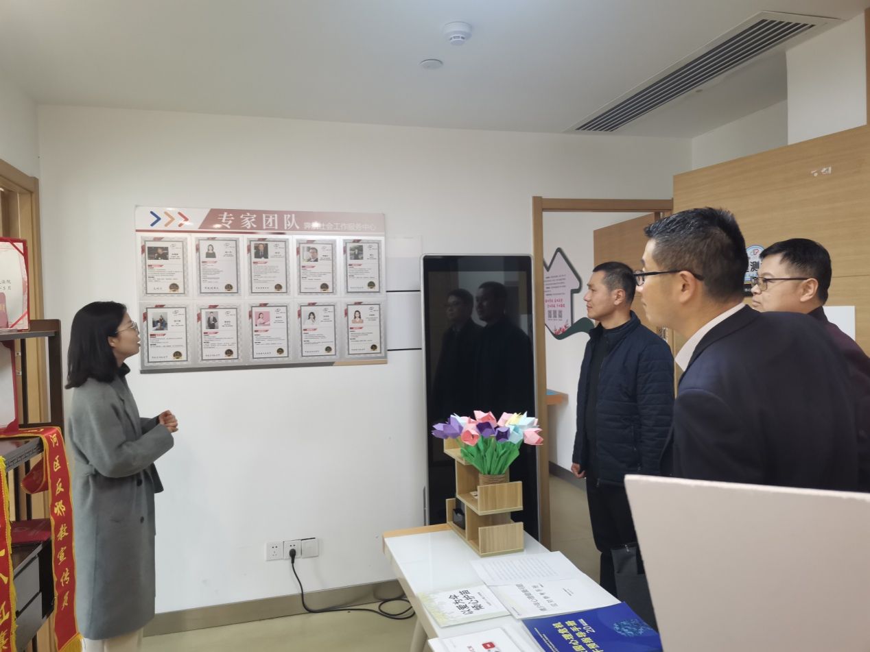霁航社会工作服务中心负责人柏一博、主任刘夏艳等陪同参观了心理测量室、沙盘游戏室、心理咨询室等部门。刘夏艳介绍了中心的基本情况和开展社会服务项目。