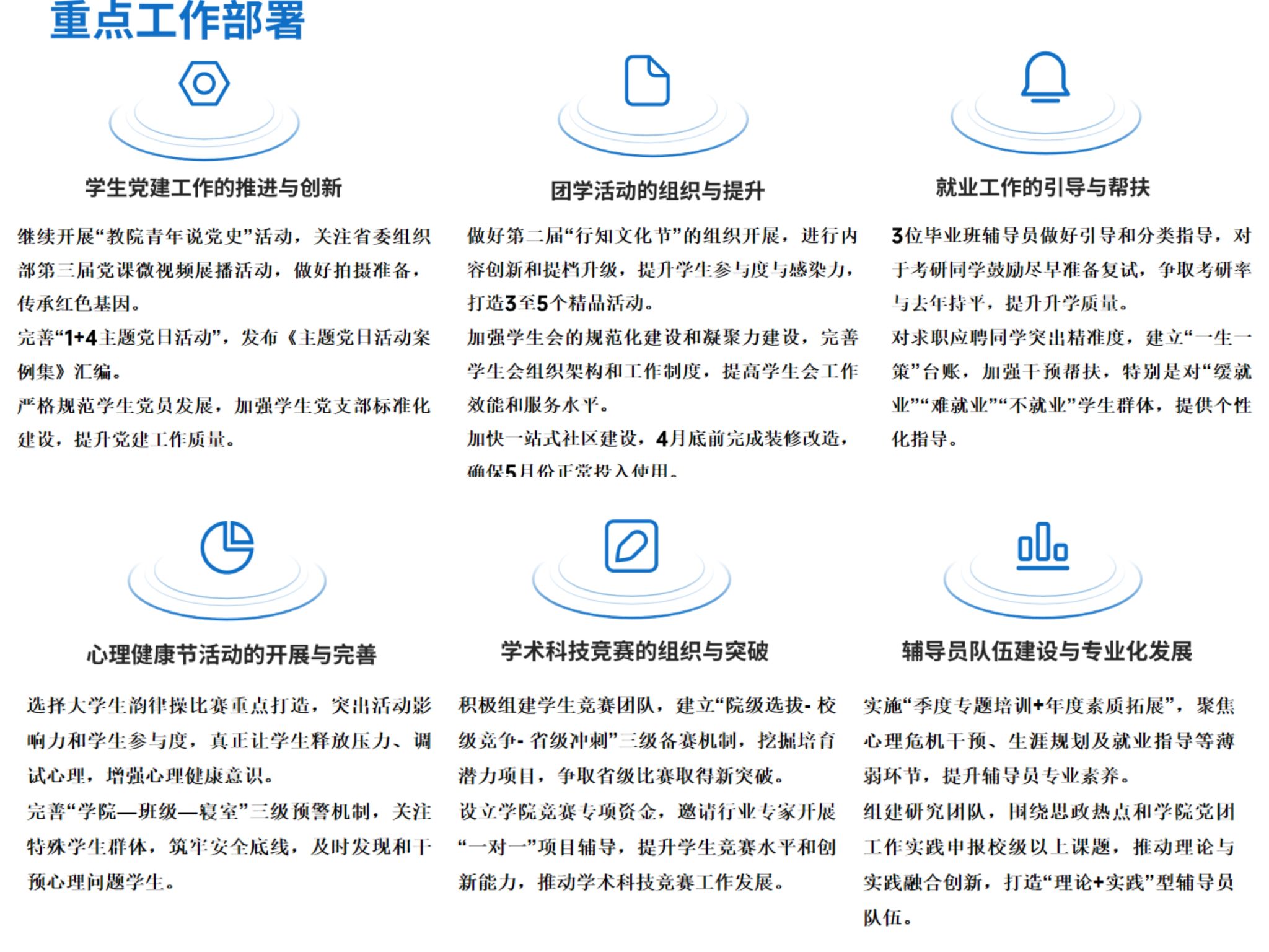 董萍充分肯定了上年度学生工作成效,并就新阶段工作提出四点要求:一要提高政治站位,坚持“为党育人、为国育才”使命,将思想政治教育贯穿工作全过程,二要聚焦学生成长,以“五育并举”为抓手,在科创实践、生涯规划、困难帮扶中提升育人实效,三要强化队伍建设,鼓励辅导员加强理论学习与研究,争做“理论+实践”型学工骨干,四要深化党建引领,推动党建与学工深度融合,以高质量党建带动团学组织、班级建设协同发展。董萍勉励全体专兼职辅导员要以积极奋进的姿态,主动融入学院发展大局,为培养新时代高素质人才贡献更大力量。