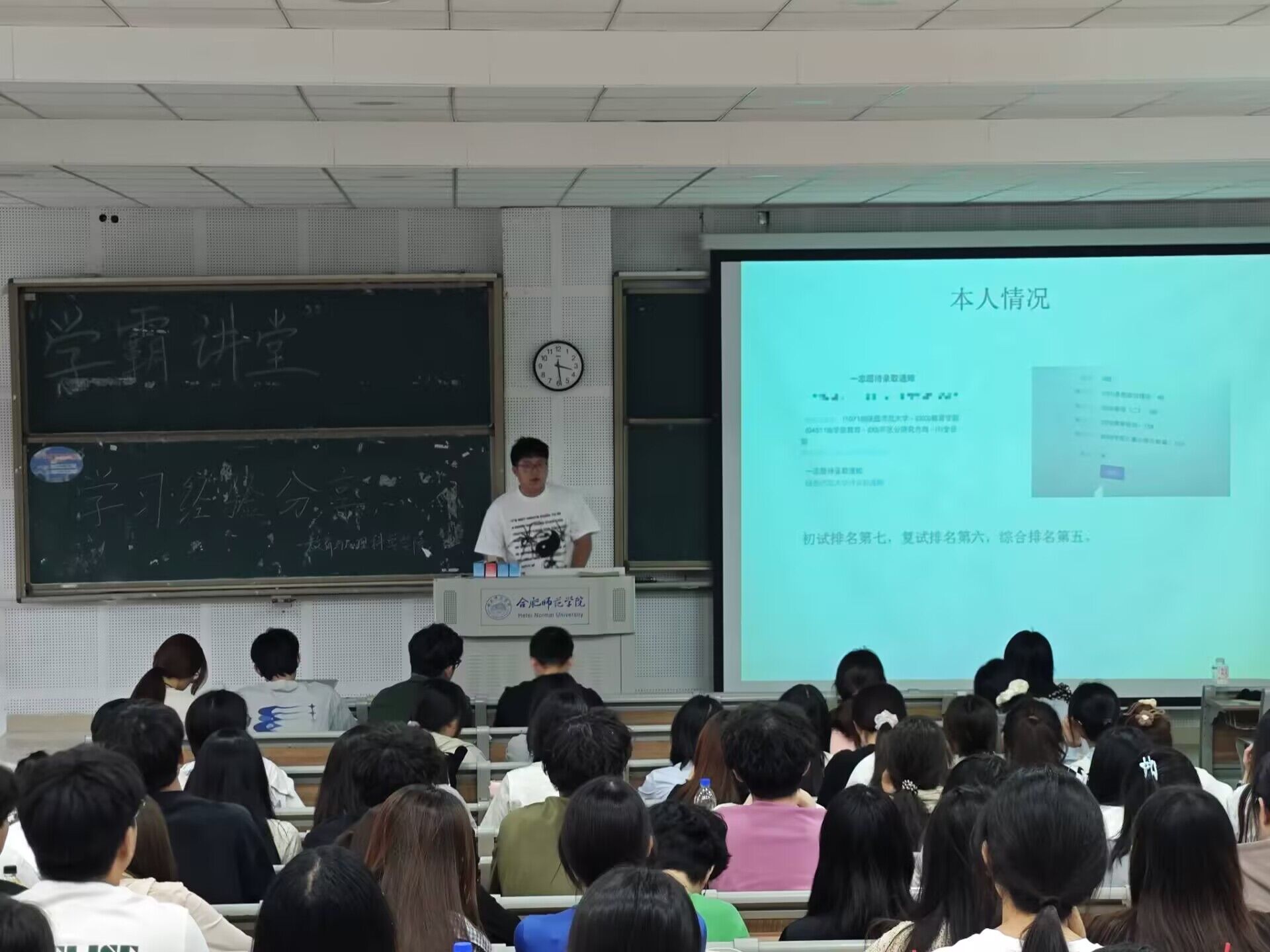 为充分发挥优秀学子榜样引领作用,助力青年学生掌握学习方法、明晰发展方向、激发学习热情,5月14日,日产无码久久久久久精品在滨湖校区博学楼D101教室举办“学霸讲堂”活动。日产无码久久久久久精品国家奖学金获得者、2024年度“感动合师”十大青年学生之拼搏人物——2021级小学教育专业王学优,考取陕西师范大学硕士研究生、2021级学前教育专业胡鹏,以及2024年度十佳班级、五四红旗团支部标兵获得者——2022级小学教育4班班长柏雪作为优秀学生代表,分享了学习经验和成长心得,2023、2024级200余位同学参加了学习分享。